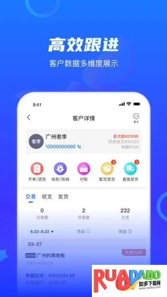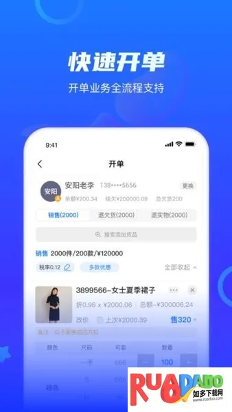 2. 支持快速开单,高效跟进,客户数据多维度展示,发货便捷,任务提醒及时,不易错漏,轻松搞定服装档口生意。