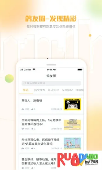 2. 设有鸽友圈,能交流互动,分享保险知识,还有精选干货和行业资讯。