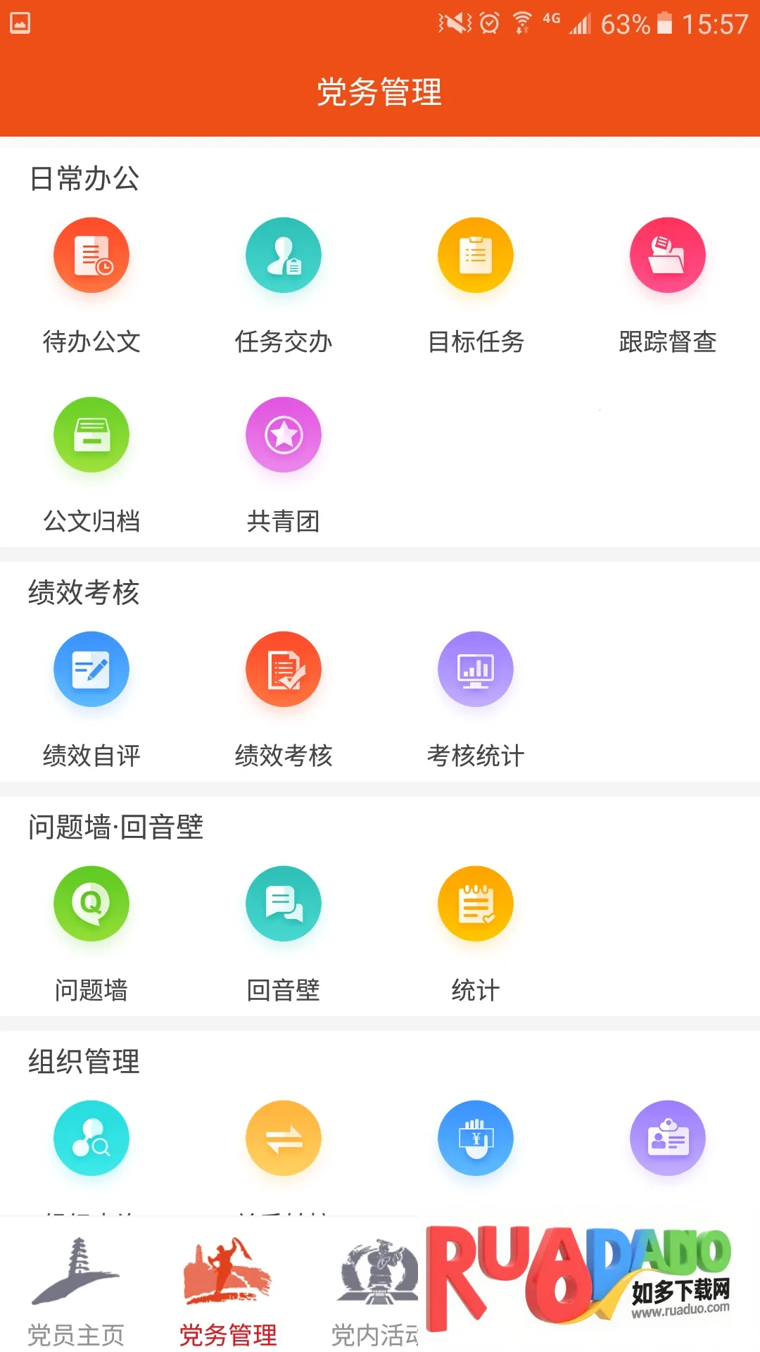 4. 管理板块设置党建大数据等栏目,通过大数据统计分析实现党建工作信息化管理,个人板块提供个性化服务。