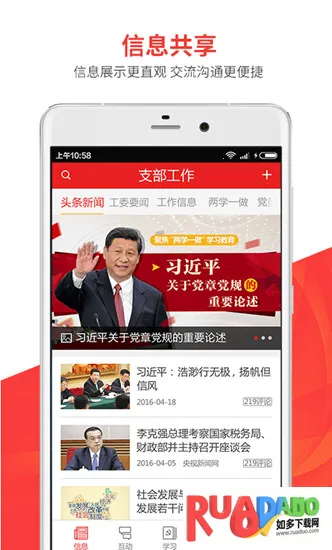 支部工作app是党政机关运用大数据算法与移动互联网特性打造的党建软件。分信息、互动、学习、管理、个人五大版块,能形成党建大数据,实现实时查询与统计分析,促进党员交流学习,反映机关建设真实情况。