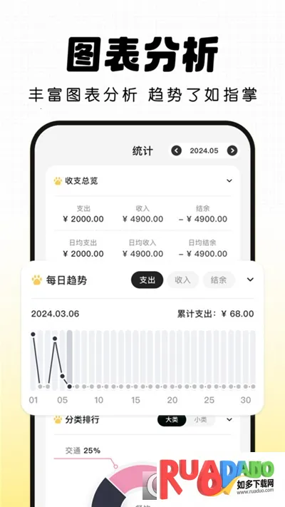 3. 丰富的图表分析,趋势了如指掌,清晰地展示出消费的分布图。