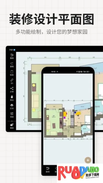 装修设计平面图由深圳市马步多多科技有限公司推出,是移动设计软件。能随时随地平面设计,功能全,支持多种格式导出,有3D查看效果,免费功能多,操作便捷,可辅助装修绘图、分享导出,不断更新优化。