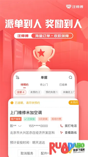 汪师傅是京东官方推出的安装平台,专为京东师傅打造。支持移动端办公,功能涵盖接单、预约、服务反馈等。师傅覆盖全国,交易安全有担保,还有学习考试等功能,助力师傅高效工作。