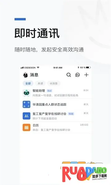 4. 即时通讯便捷,消息触达人可随时发起音视频会议、文档协同,支持任务日程派发,保障安全高效沟通。