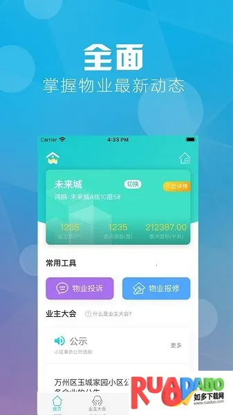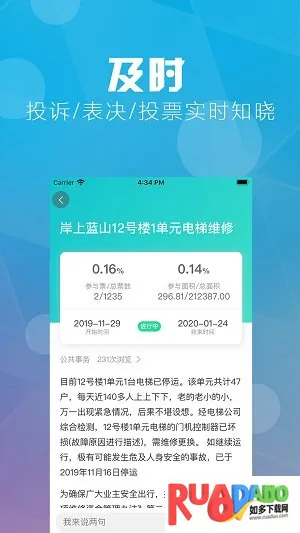 3. 提供专业在线业主社区服务,加强业主与物业沟通,业主能参与小区事务,轻松查看、在线投票,及时了解重要通知。