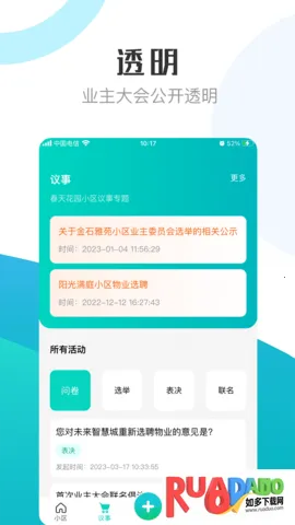 4. 公开透明小区管理,含各种投票表决,加强物业与业主沟通。
