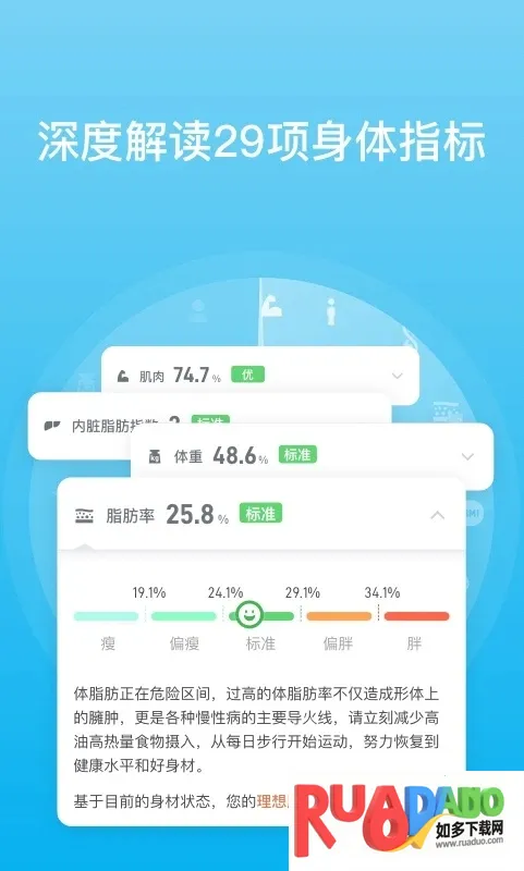 想知道有品体脂秤准不准?它可是个能帮大忙的好工具!有品体脂秤app能搭配智能体脂秤使用,帮咱监控每日消耗的卡路里和运动量。它能自动记录全天运动量,换算运动卡路里消耗成燃烧脂肪量,还能智能学习咱的运动活跃时段,提供个性化运动指导。通过它,能深度分析多项健康数据指标,像体重、脂肪率、内脏脂肪指数等,及时发现身体状态滑坡迹象。基于大数据分析,能提供实用的运动与营养建议,让咱有计划地改善身体。全家人都能用,数据随时同步,来访客人也能体验测量分析服务。添加使用人方便,连接电子秤简单。用它就能清晰了解身体状况,为健康管理提供有力支持,真的超实用!