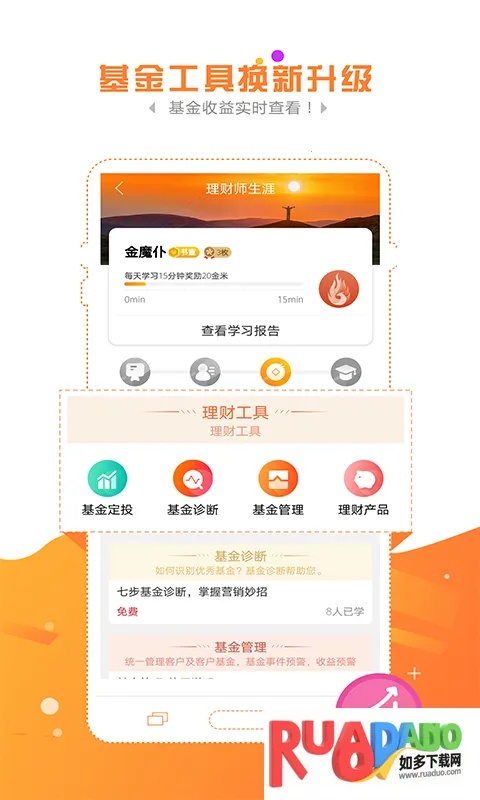 金魔仆安卓版是北京金挚科技为银行从业者打造的金融理财应用。能学海量课程、获营销话术,还可定制职业提升计划、管理客户。功能全,操作简,不碰客户资料,助您提升业务水平。
