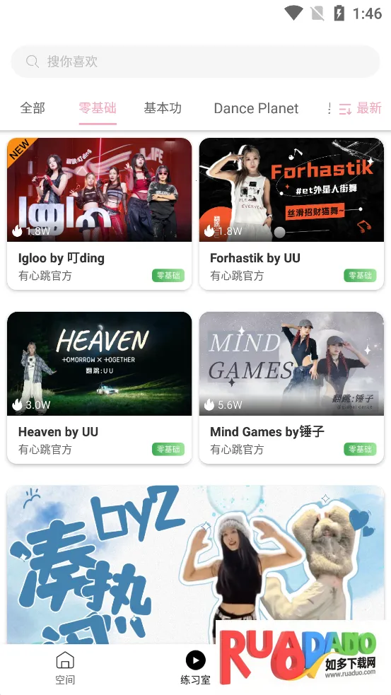 3. 内容精心分段,潮流MTV舞、女团舞、韩舞、街舞、爵士舞等丰富多样,当红素材每周更新。