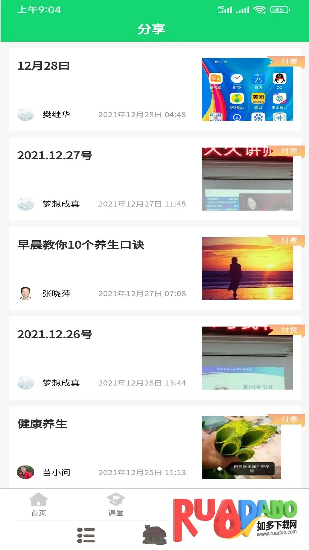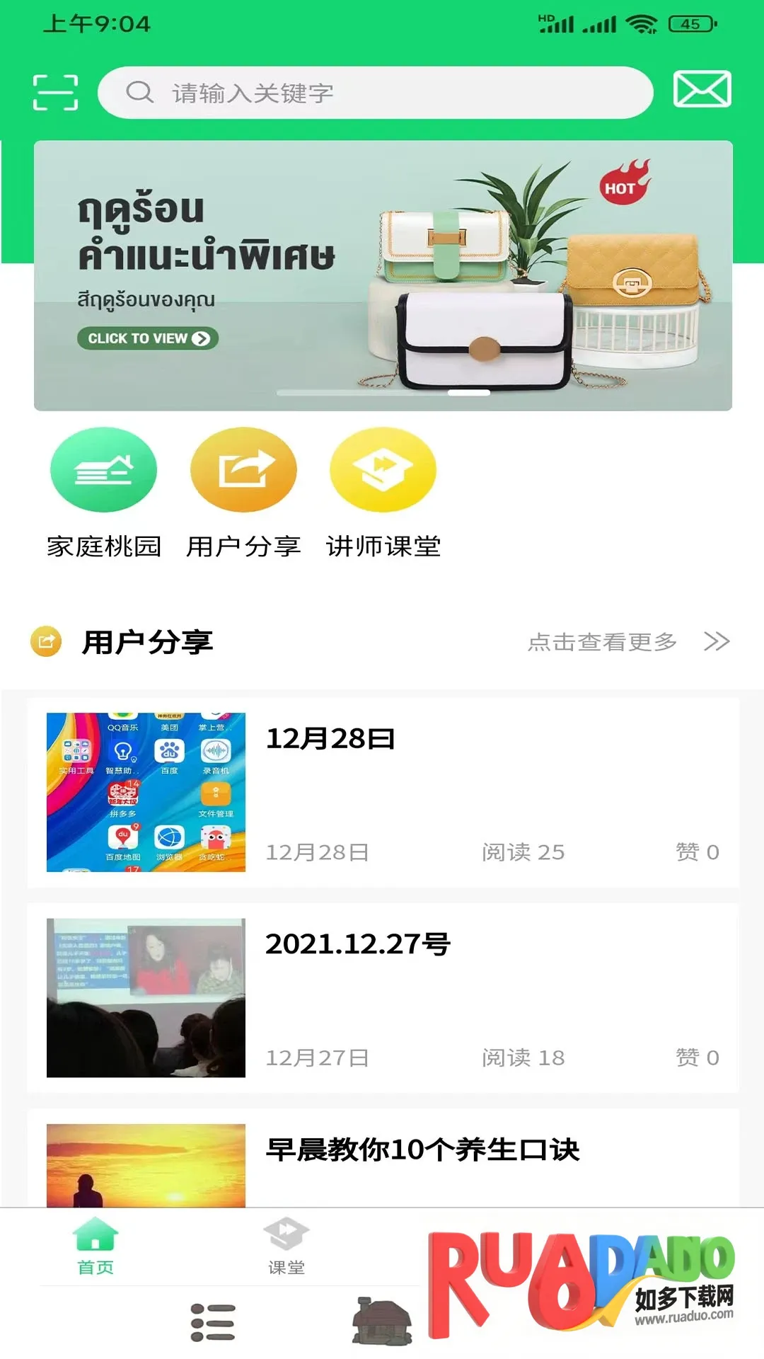2. 设有多种板块,如首页展示各类资讯且置顶热门,“我的”展示个人相关内容,分享板块可交流互动,课堂包含视频资讯与生活妙招分享。