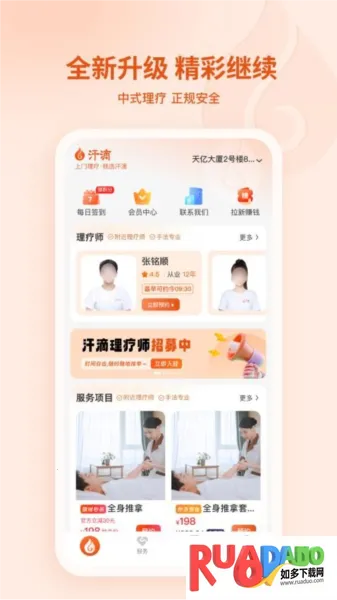 汗滴APP官方版是专业上门按摩服务平台,汇聚大量专业按摩师,有丰富资料供选。提供多样服务项目,明码标价,支持在线预约,还有自动匹配等亮点,能满足用户放松及护理需求,体验舒适之旅。