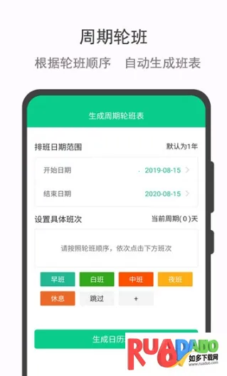 3. 能自动生成轮班表,选择轮班开始与结束日期即可生成一年周期轮班表。