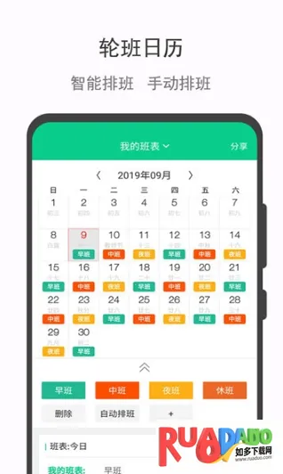 2. 是为倒班人群设计的专属日历班表,支持手动和自动排班。