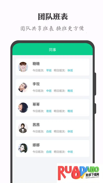 1. 有萌萌的同事头像,可记录手机号码与班表,方便联系同事。