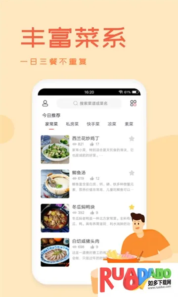 1. 汇集海量家常菜,来自全国各地,无论想做什么材料的菜,打开搜索菜谱,都能马上找到相关美味菜谱。