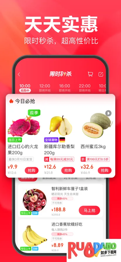 2. 依托强大供应链网络,全国各地快速供货,下单后很快就能收到新鲜的当季水果、蔬菜、活鱼鲜肉等商品。