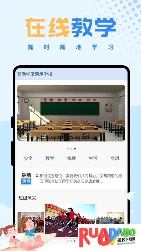 4. 提供丰富功能,如学生考勤、成绩管理、校园通知、资讯发布展示、学生作品展示、班级活动展示等。