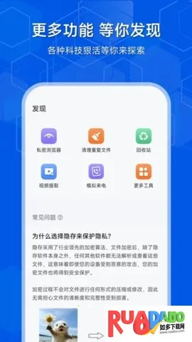 隐存这款软件能很好地满足你对隐私保护的需求。它具备强大的加密功能,可加密照片、文件、笔记等重要资料,全方位守护隐私。有实用的密码管理器,能安全保存并管理所有账号和密码,再也不用担心忘记或泄露。文件保险箱为重要文件提供双重保护,防止未经授权访问。卡证夹能集中存储各类证件信息,方便查看管理还不怕泄露。采用行业领先的强加密技术,保障数据传输与存储安全。软件亮点众多,能全面加密隐私信息,从密码到文件照片全方位管理数字生活,提供顶级加密技术确保安全,重要资料存储访问便捷高效。其功能丰富,私密空间可安全保存多种文件,密码本管理密码方便,卡包整理证件,网址收藏夹留住喜爱网站,私密联系人保护重要联系人信息,还有多种隐私保护方式,如密码解锁、紧急切换、闯入抓拍、虚假密码、私密浏览器等,工具箱里还有多种黑科技和媒体处理工具,真的非常实用。
