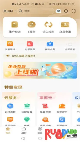 2、可实现账户管理、转账汇款、贷款融资等企业银行服务,全方位对接银行业务。