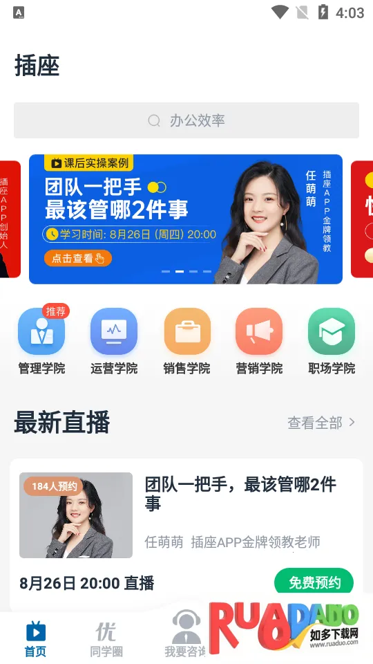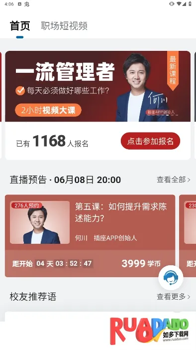 插座App培训是一款超棒的职场学习工具。它针对职场人士打造,有丰富的课程资源,免费和收费的都有。能帮你在线看感兴趣的直播大课,直播预告详细,课程主题、讲师等信息一目了然。这里有多种课程服务栏目,涵盖团队管理、品牌文案等多种管理视频课程。支持两种视频播放模式,还能统计展示上新数据。它能解决职场人目标不清晰、工作没信心、上下级关系不好等问题。通过咨询师诊断和教练辅导服务,上百位咨询师提供一对一服务,助你在职场持续进阶。其制度性强,班主任等管理制度完善;互动性好,学习社群能互动互助;规律性佳,按记忆曲线安排教学。有了它,随时随地就能提升自己,让职场之路更顺畅,强烈推荐!