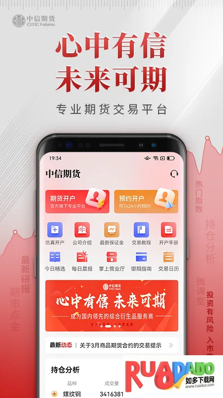 中信期货全功能版app能满足各类期货投资需求。它提供线上期货开户,行情与交易集内外盘行情实时追踪、郑商所五档行情、境外17家期货交易所实时高频行情等功能于一身,还有仿真和实盘交易登录方式以及多种下单方式。期权行情及交易功能涵盖已上市商品期权品种的行情、交易、行权等。信研云资讯提供各类研究报告、品种资讯等。基金理财精选众多产品。