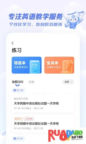 在天学英语学生端,找模拟题其实很简单。它有大量英语教辅图书课程资源,能满足你做模拟题的需求。软件里的听力满分、词汇满分、数学微课等特色板块,为你提供了丰富多样的学习内容。比如听力满分有个性化自主练习产品,能根据测试结果智能推荐练习内容,还推送错题同类题,举一反三。词汇满分通过智能测评练习,帮你快速定位词汇薄弱项。数学微课有北大名师精彩讲解,配套课后练习。软件亮点众多,详细的学习记录、完整的作业考试分析报告、错题本功能等,能让你清晰了解自己的学习情况,合理安排时间,查漏补缺。而且一线权威教师在线答疑,能及时解决你学习中遇到的问题。有了这些功能,做模拟题变得轻松又高效,能有效提升你的英语水平,快来体验吧!
