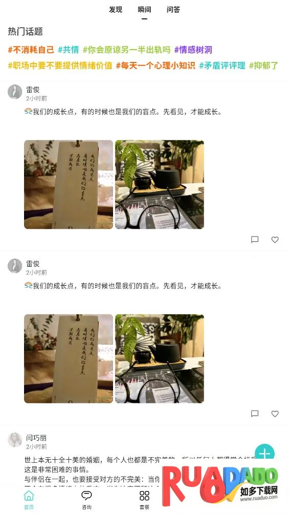 其功能丰富多样。倾听咨询板块,专业心理师会一对一深度对话,助你排解情绪压力。情感咨询专注情感领域,探索幸福真谛。家庭婚姻板块解决家庭矛盾,促进沟通。心情社区可分享感悟,结交朋友。问答话题能探讨心理健康,获取实用建议。