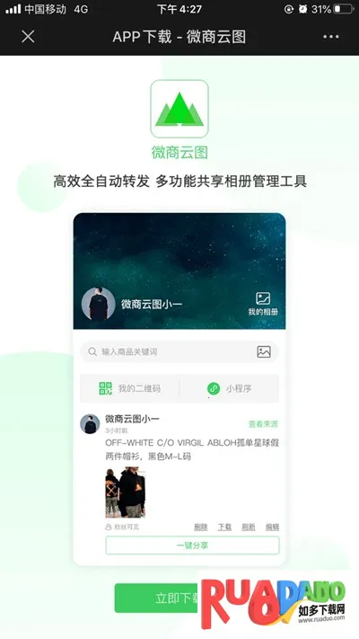 如果你遇到微商云图打不开的问题,别担心。微商云图app是一款超棒的微商工具软件。它能一站式发圈,无需存图,轻松解决发圈烦恼。有多相册管理功能,就算产品多、分类难也不怕。还能实现多社交渠道分享,像是你的进存销系统。软件亮点多多,做图快速方便,有丰富海报模板提升产品颜值。能三秒记录订单并查询物流状态。优势也很突出,可创建云端相册,内容来源多样,不占手机空间,智能搜索易调取。支持一键分享朋友圈,员工、代理关注相册就能随时查看上新推广图文并分享。线上店铺可同步商品,全网采集素材,团队共享协作超便捷。它能大大简化微商团队工作流程,是微商的得力助手,快去试试解决打不开的问题,感受它带来的便利吧。