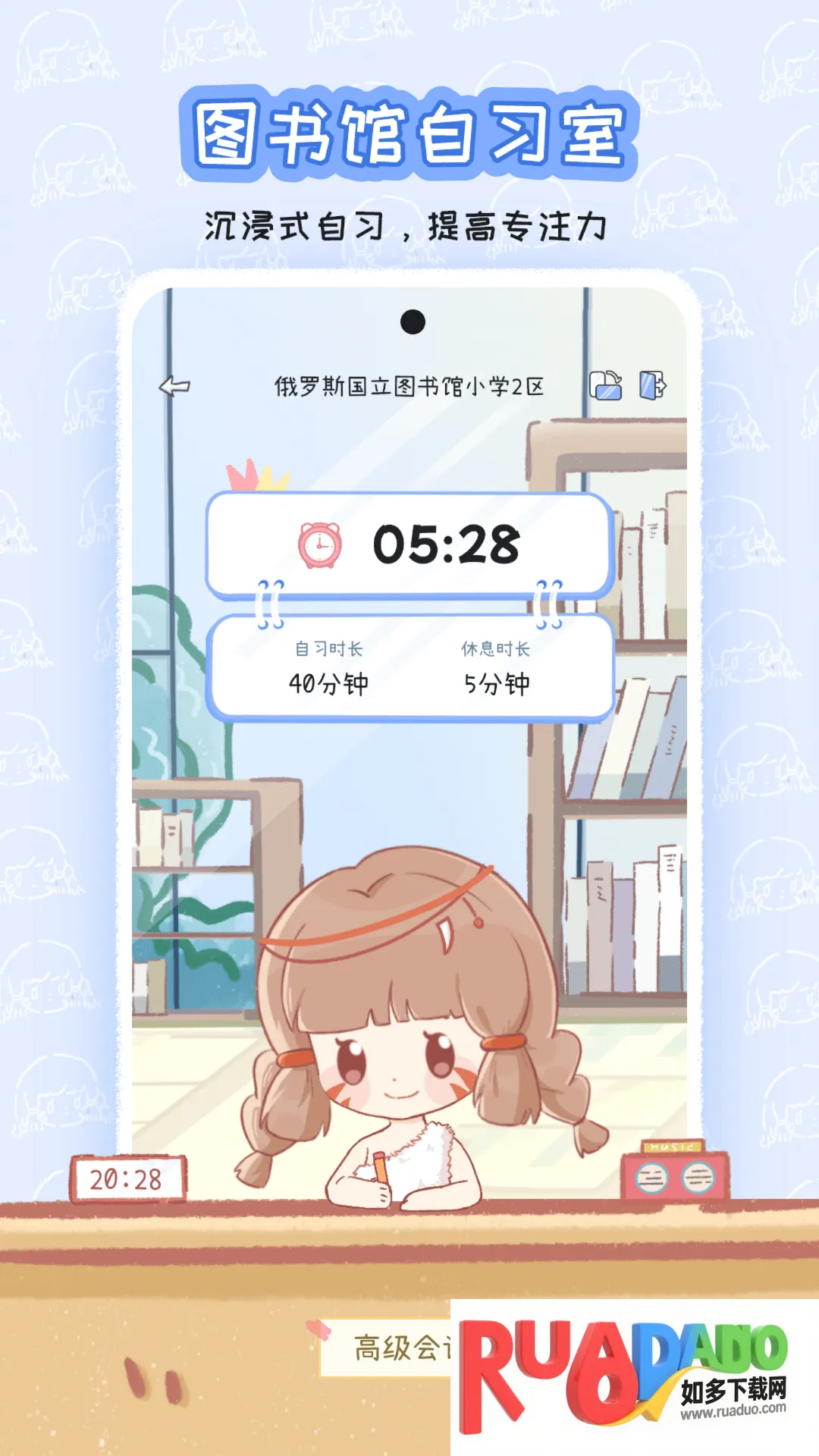 2. 模拟图书馆学习环境,提供沉浸式自习空间,能选择不同自习区域,配合专注计时器,营造安静高效学习氛围。