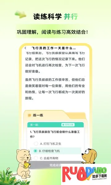其功能十分实用。会根据孩子阅读能力提升,后续文章自动进阶。运用智能AI技术测试认字数量,方便了解孩子学习情况。对于不同文章,一点就能知晓文字发音。亮点也很突出,千人千面制定专属学习计划,能查看每天阅读数据,清晰看到成长曲线。科学的文章搭配巩固练习,让孩子学到新知识。评价也不错,有精美的故事绘本提升学习兴趣,还有很多精品原创文章,每篇文章都有不同难度值,能全方位助力孩子英语学习,快来下载体验吧。