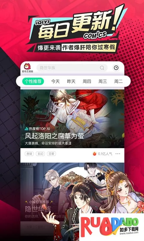 1. 优质漫画每日新,涵盖恋爱、古装、玄幻等多样题材,国漫日漫海量呈现。