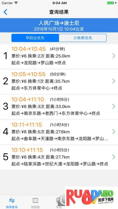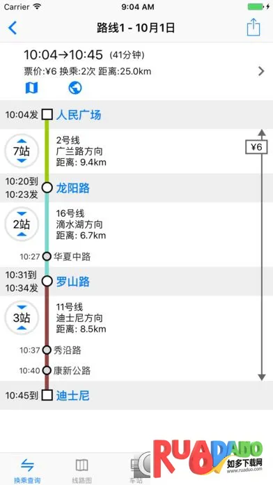 2. 输入出发站、到达站及时间,就能获得含路线、时间、票价、距离等详细信息的多种换乘方案,方便规划行程。