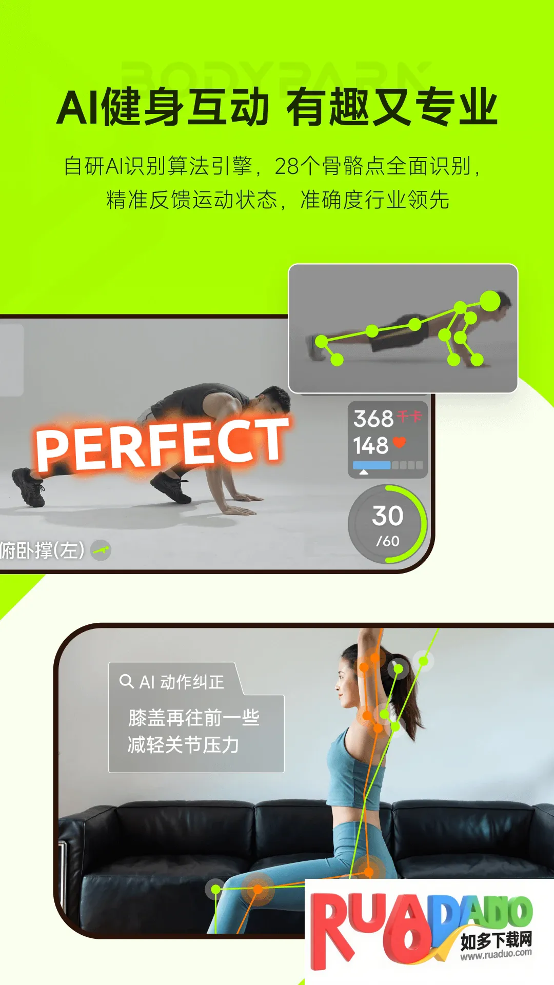 3. 运用AI体感技术,将健身与游戏结合,动作纠错,让健身有趣易坚持。