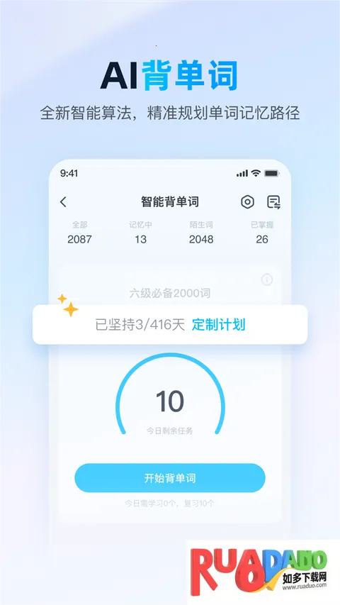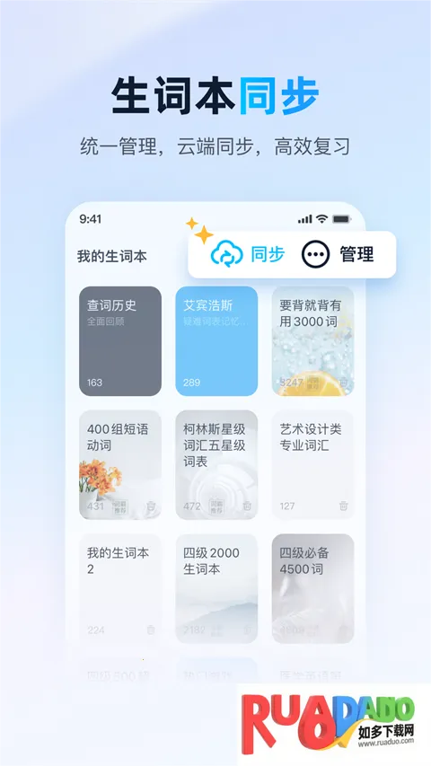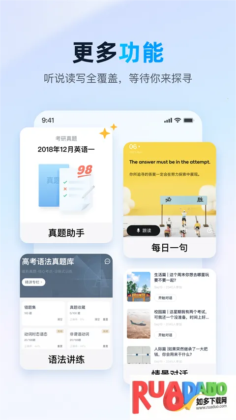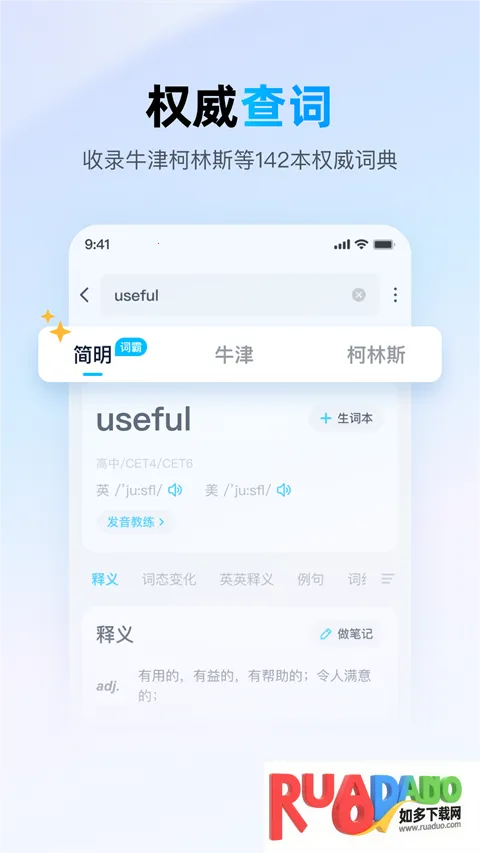 2. 能提供海量词典真人发音、整句翻译、情景会话等实用功能,依用户大数据采集信息定制专属词库。