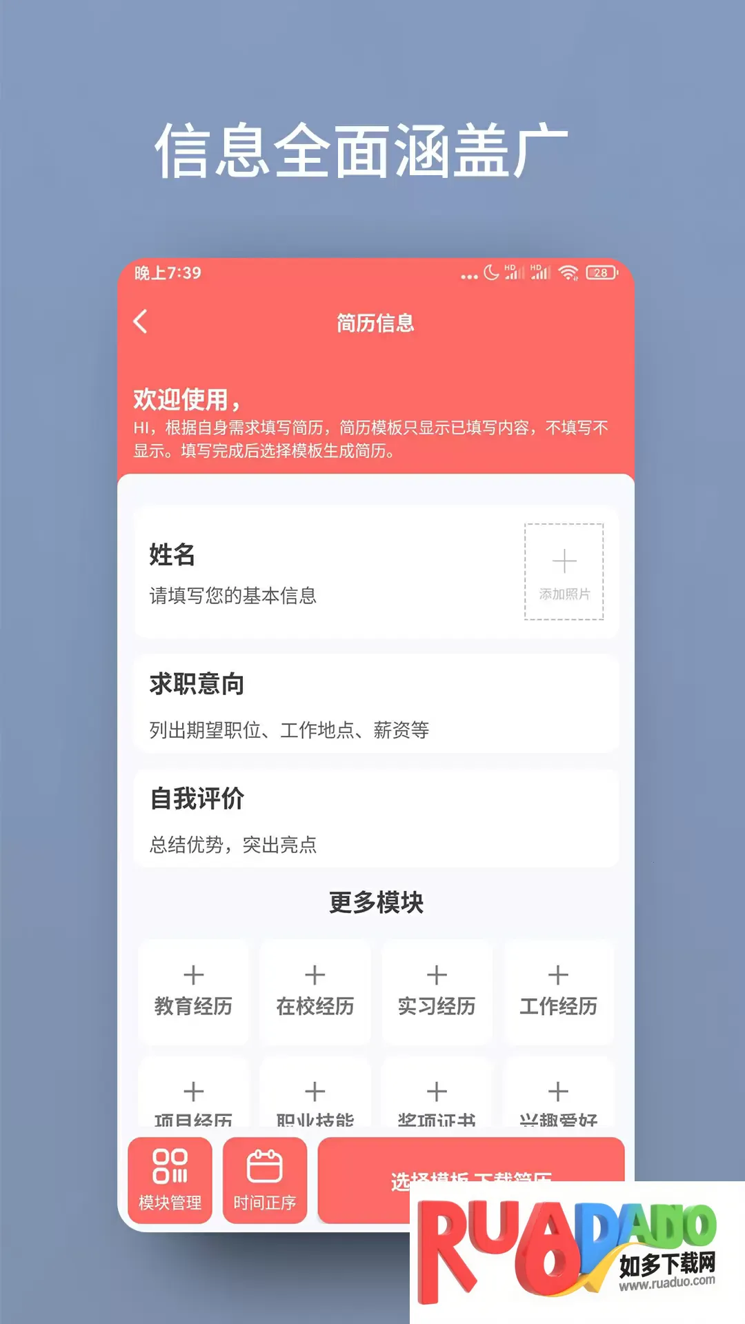 1. 操作简单直观,不同背景使用者都能轻松掌握,从学生到职场人士都可迅速制作规范得体的求职简历,提升就业竞争力。