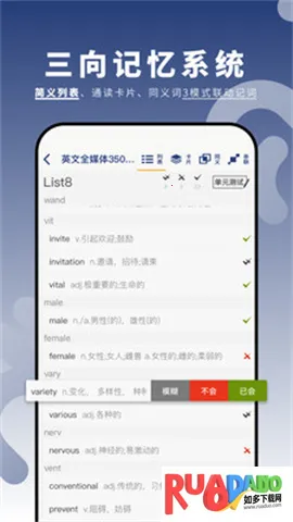 3. 独特三向记忆标记与测试机制,区分生词熟词,复习简单可控。