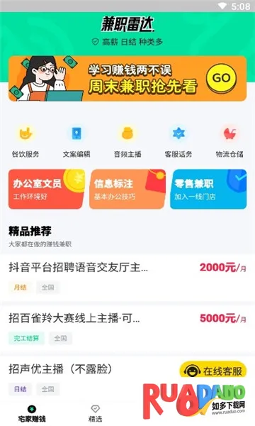 想宅家赚钱?兼职雷达就能帮到你!它是一款超靠谱的线上求职软件。这里岗位信息审核严格,有海量丰富又靠谱的兼职岗位,日更新岗位达1000条,活跃兼职岗位10万。有业内首创的在线岗位巡查团,人工抽查招聘雇主信息,保证岗位真实。还网罗10万家兼职商家,能高效匹配招聘求职需求,1分钟就能找到心仪兼职。它有多样选择,像外卖骑手、便利店员等各种岗位任你挑,还有信息标注、文案编辑等新兴特色岗位专为千禧一代准备。而且有多重保障机制,实名审核、企业审核、人工智能风控、100%人工审核岗位评价等,发布人实名认证加人脸认证杜绝冒用身份,企业信息人工校验,人工智能还能过滤下架不合规岗位。让你足不出户在家就能轻松找到适合自己的兼职,工资日结,赚钱更放心,赶紧下载试试吧!