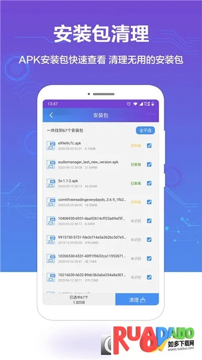 2. 可快速查找并卸载无用应用程序,清理应用缓存及过期apk文件。