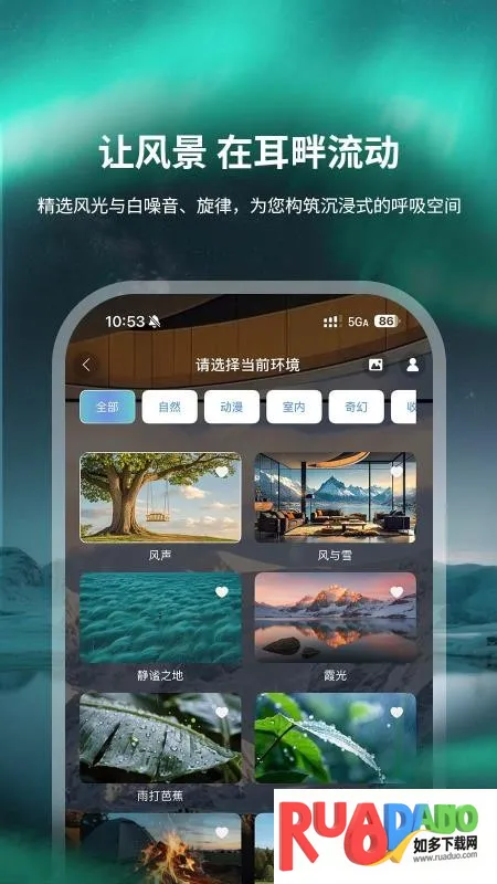 3. 多样音乐:多样音乐乐行,各种自然、动漫、室内、奇幻等声音全都有,可自由选择体验。