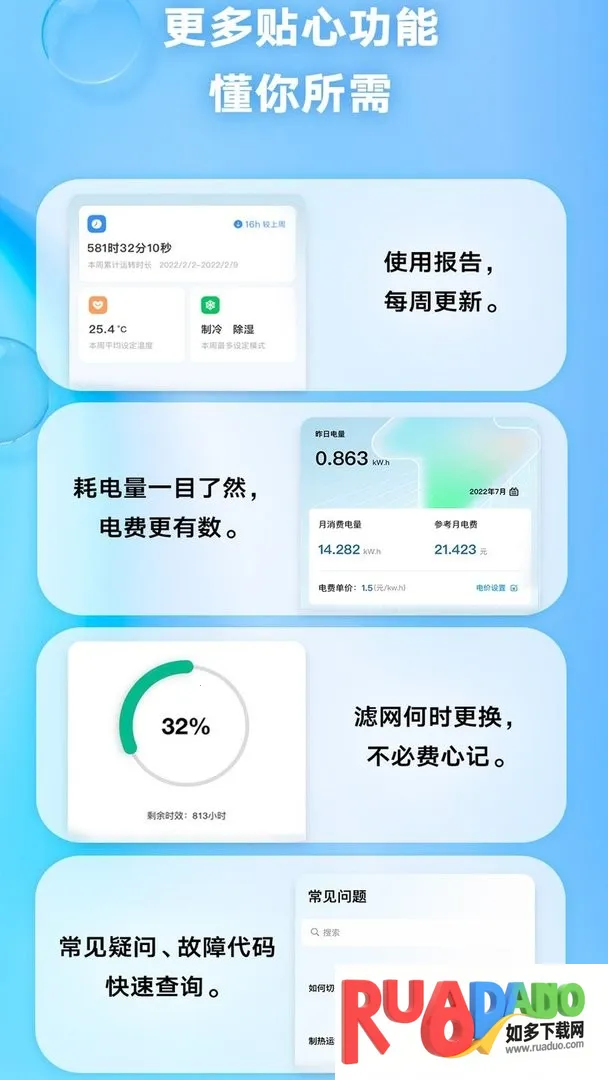 4. 功能结构层次清晰,常用功能距离用户更近,滤网剩余时效、电量消耗可查询 。