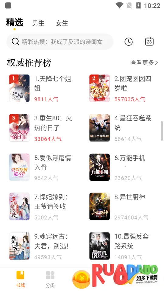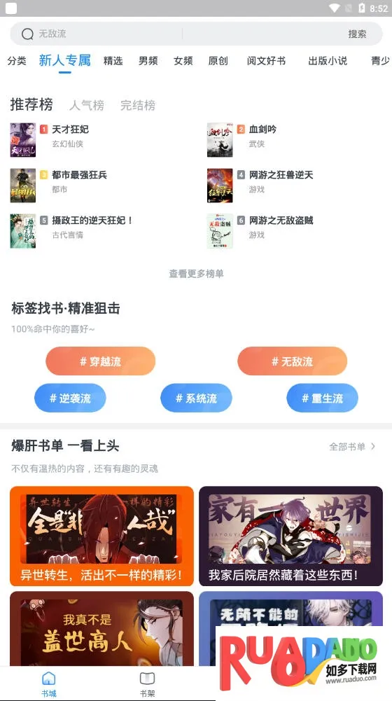 4. 小说分类严格,能在相应模块找到喜欢的资源,还可直接搜索,且书架云端保存,切换设备无缝衔接。