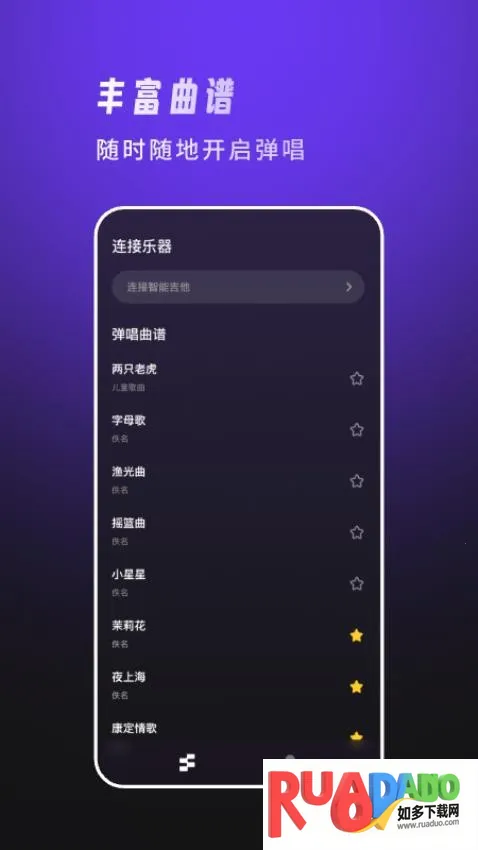 使用方法也很简单。先点击智能吉他按钮与吉他配对,打开蓝牙权限即可连接。连接后就能找曲谱,开启智能跟练模式。即使是零基础的用户,也能依据软件中的知识自由练习吉他,收藏喜欢的乐谱,随时在收藏夹中打开参考。有了天谱乐,让你轻松实现零基础自学吉他,快来下载体验吧!