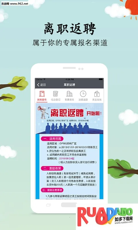 4. 支持在线报名和入职流程,实时掌握公司动态和招聘政策,离职员工也能申请离职返聘。