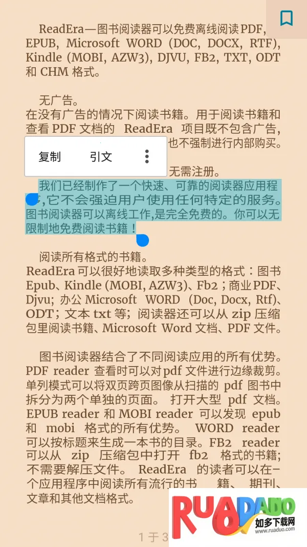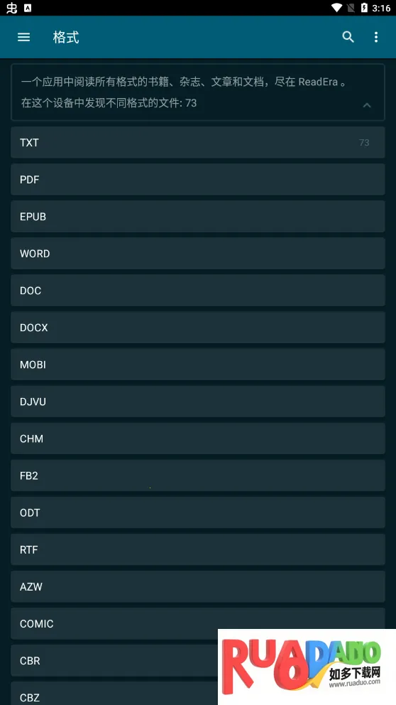 1. ReadEra支持多种格式,像Epub、Kindle、MOBI、AZW3、Fb2、商业PDF、Djvu、办公Microsoft WORD等,还能从zip压缩包里读取书籍。