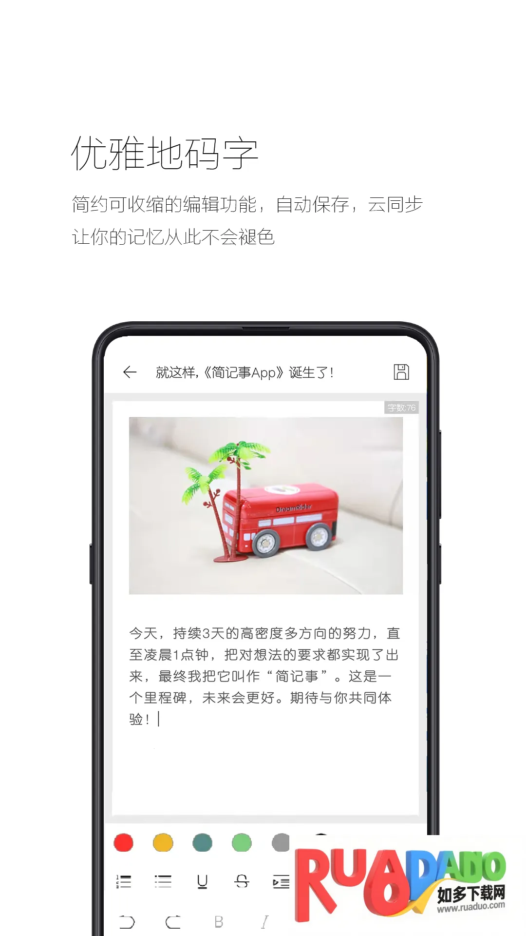 这款软件的功能十分强大。它采用极简约设计,黑白色调搭配幼细线条和文字,还有特别的动画,清新舒服。文字编写底部栏精简常用编辑功能,更丰富的功能可呼出,单手左右滑动就能操作。编写过程中会定时保存并云同步,点击返回也自动保存,数据永不丢失。它还能根据文字生成精致书签,方便分享。