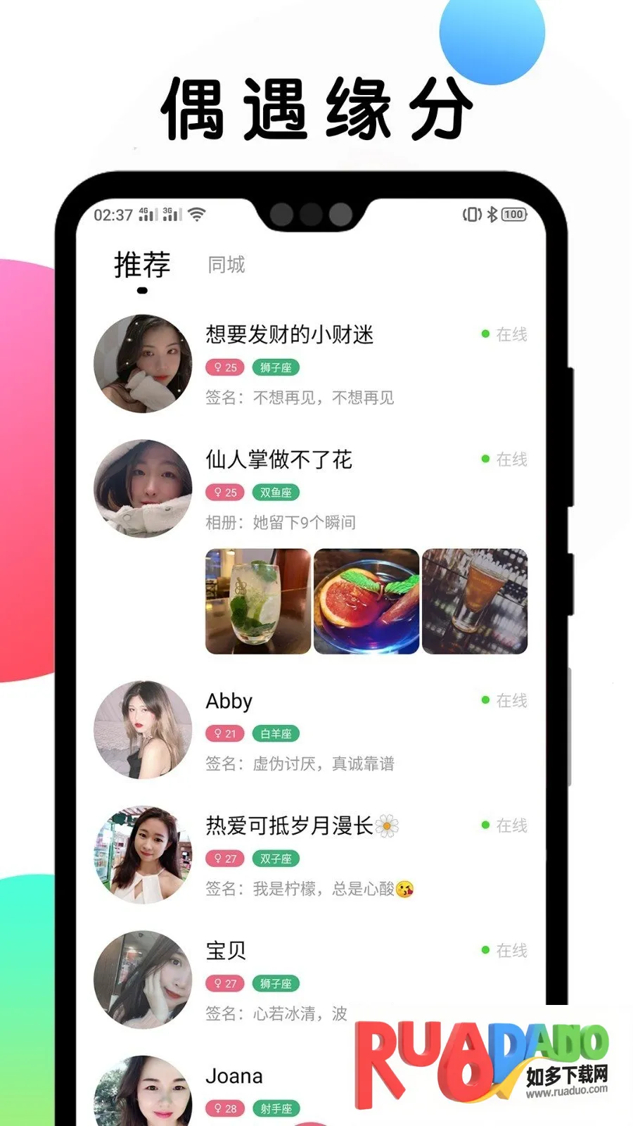 遇到交友是基于真实身份的线上交友软件,有真实用户认证。能精准过滤好友,多种社交模式可选,可发动线下活动。能文字或语音交流,展示聊天魅力,还可与附近同城好友互动,轻松结识更多有趣小伙伴。