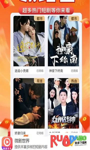 1. 微剧世界有丰富的短剧资源,各种题材任你挑选,能轻松发现满意的短剧观看。