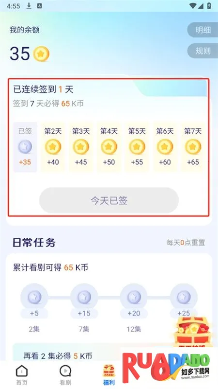 4. 短剧时间短、内容紧凑,内核强大观看流畅无卡顿,还能天天打卡签到领金币提升等级,用金币兑换福利,收藏短剧防止丢失。