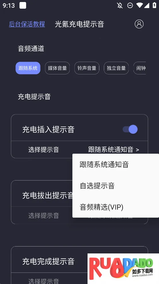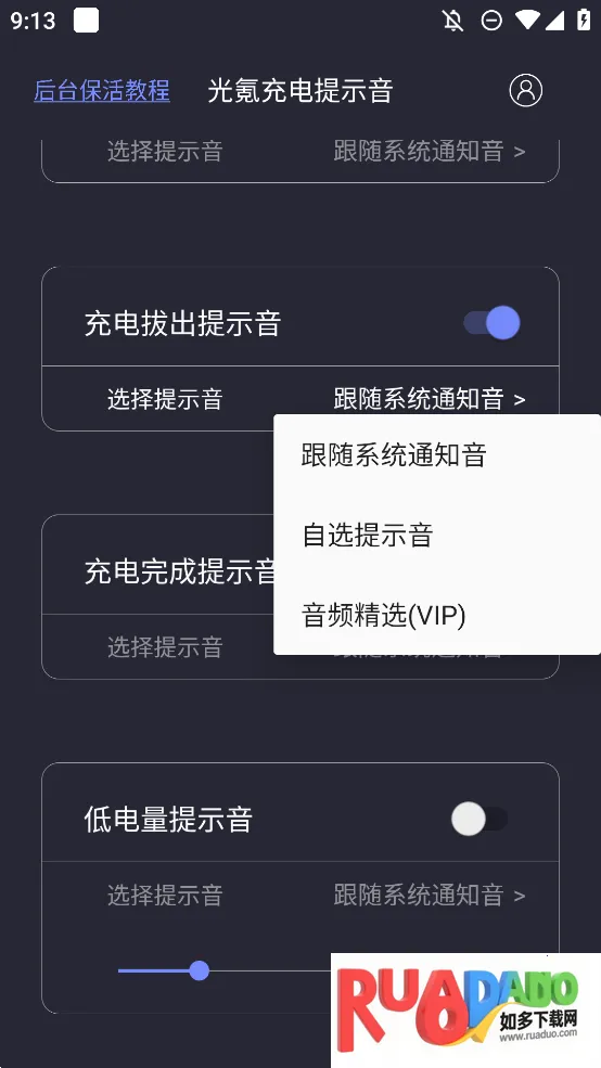 4. 随意选择,可在软件内自行挑选喜欢的提示音设置充电、拔电和满电音效。