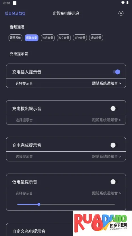 3. 能设置插入充电及拔出充电的对应提示音,每次充电都能听到喜欢的声音,从此爱上充电。